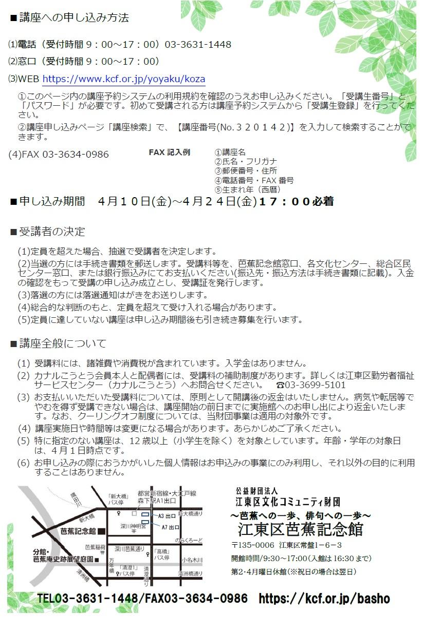 | 2026年5月30日() | 10:00~11:40「吟行に挑戦」(清澄庭園)雨天決行。荒天の場合5/31(日)に順延。 |