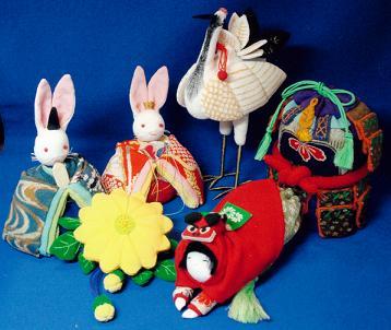 自主絹織物のちりめんや古布を縫い合わせて、季節ごとの動植物、人物、袋等をモチーフに細工物を作製します。