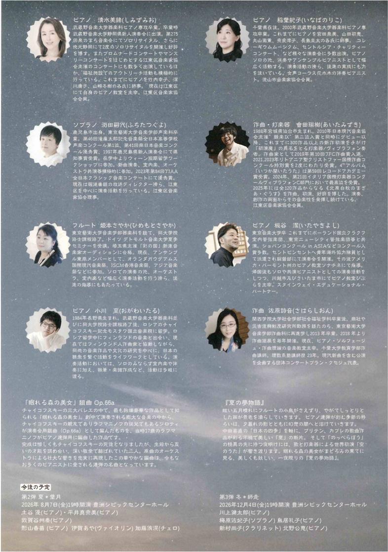 | 曲目(予定) | チャイコフスキー=ラフマニノフ/バレエ組曲 眠れる森の美女 中田喜直/「日本の四季」より(ピアノ連弾) 佐原詩音/のっぺらぼう 會田瑞樹/「空のうた」(世界初演) |